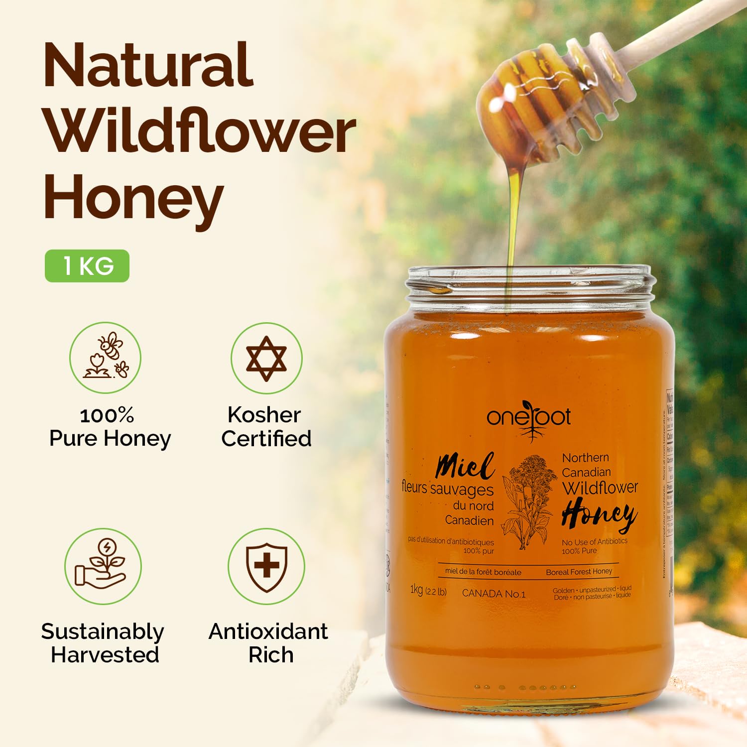 OneRoot Natural Wildflower Honey is a pure Canadian honey sourced from the wildflower fields of Northern Ontario and Quebec. It is unpasteurized, minimally filtered, and rich in enzymes and antioxidants.