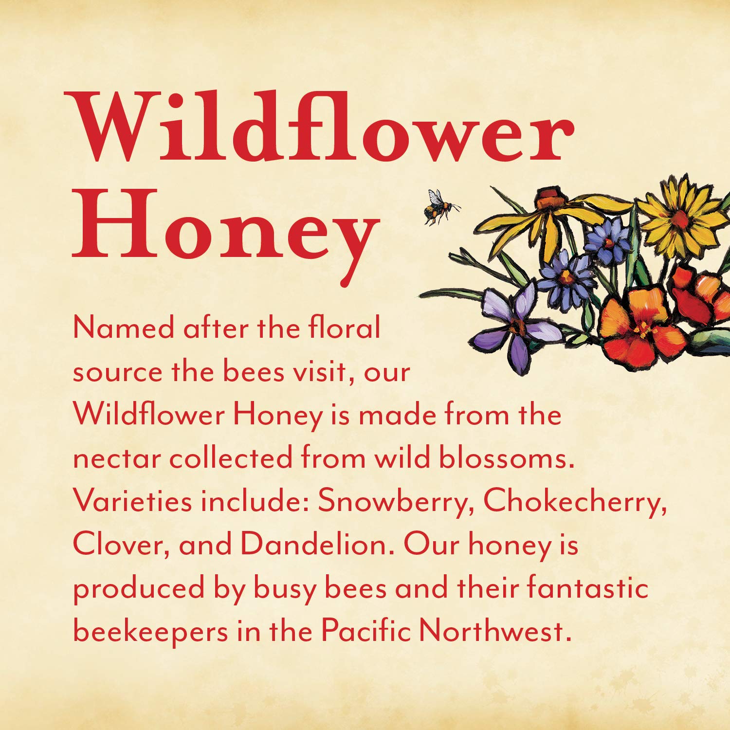 100% RAW WILDFLOWER HONEY – Oregon Growers Wildflower Honey is made from the nectar collected from wildflowers by busy bees in Oregon’s picturesque Columbia Valley, a truly farm-fresh local honey