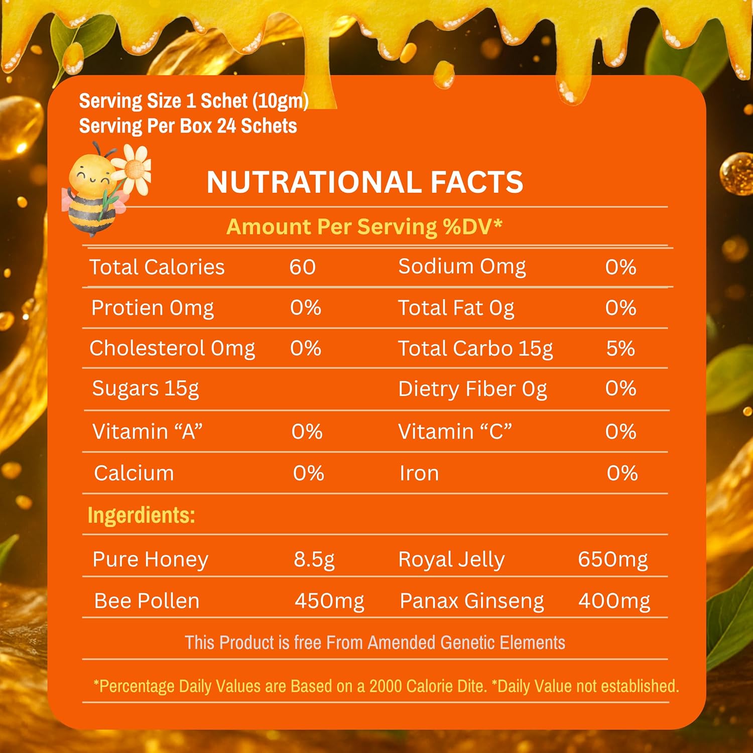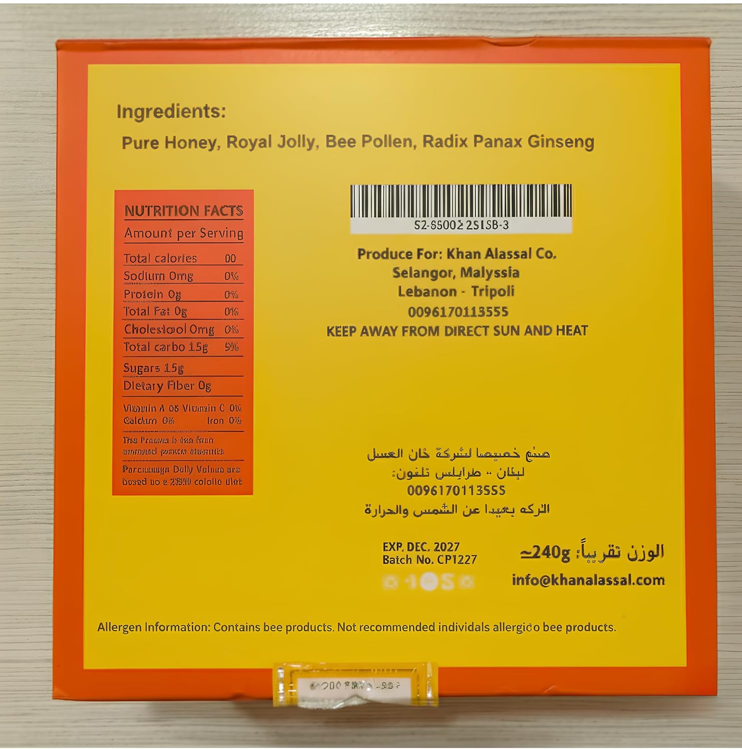 Immerse yourself in a delightful blend of organic honey and the essence of Bee Pollen, Bee Jelly, and Radix Panax Ginseng.
