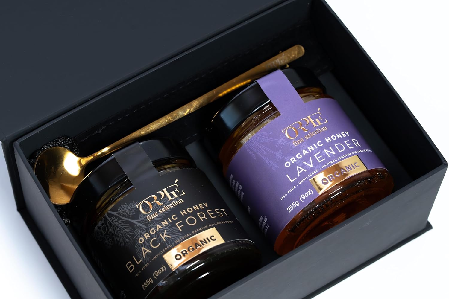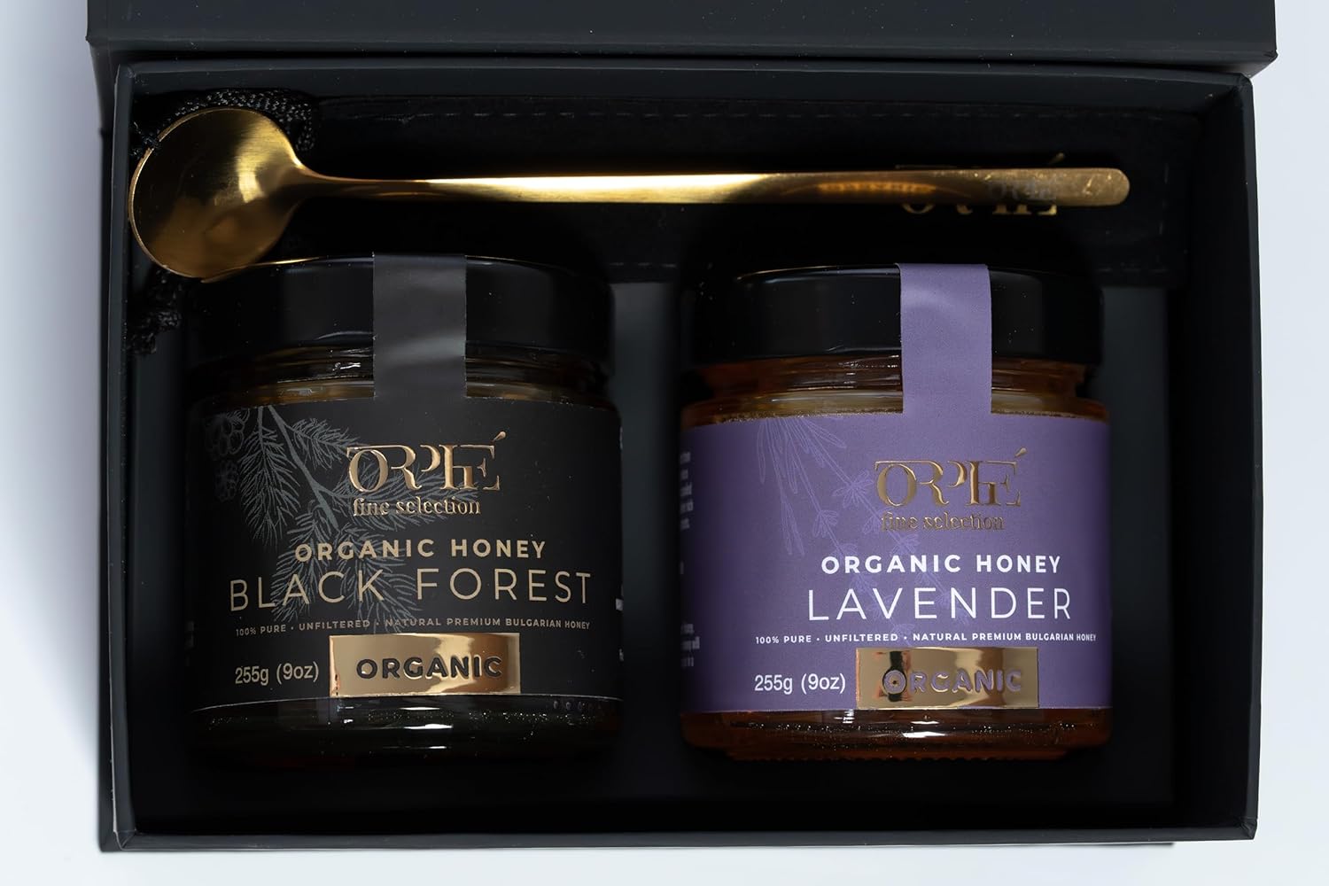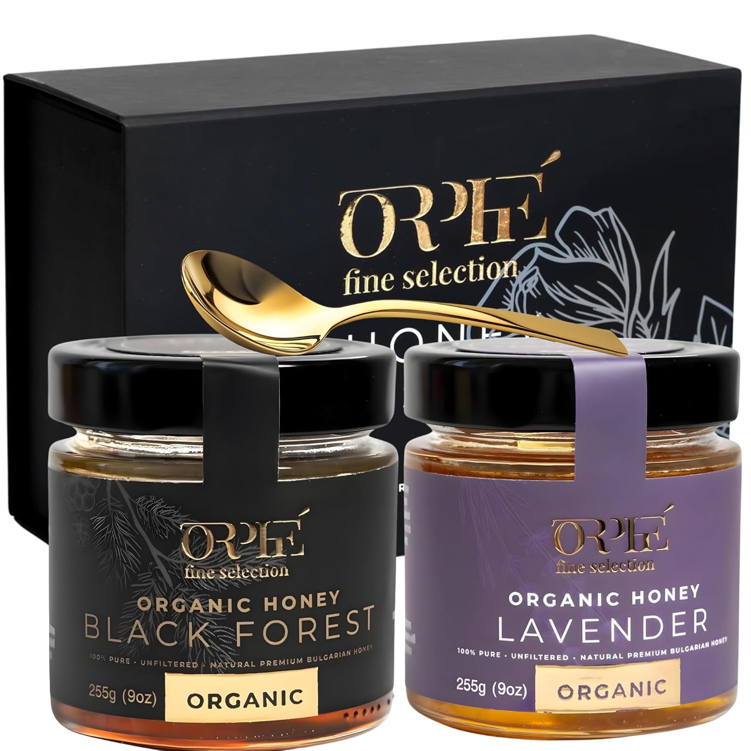Orphe Luxury Organic Honey Gift Set(17oz), Lavender & Forest with Gold-Plated Spoon, Raw Bulgarian Honey Gift Box, Natural Sweetener for Coffee, Tea, Matcha and Breakfast (Valentine)