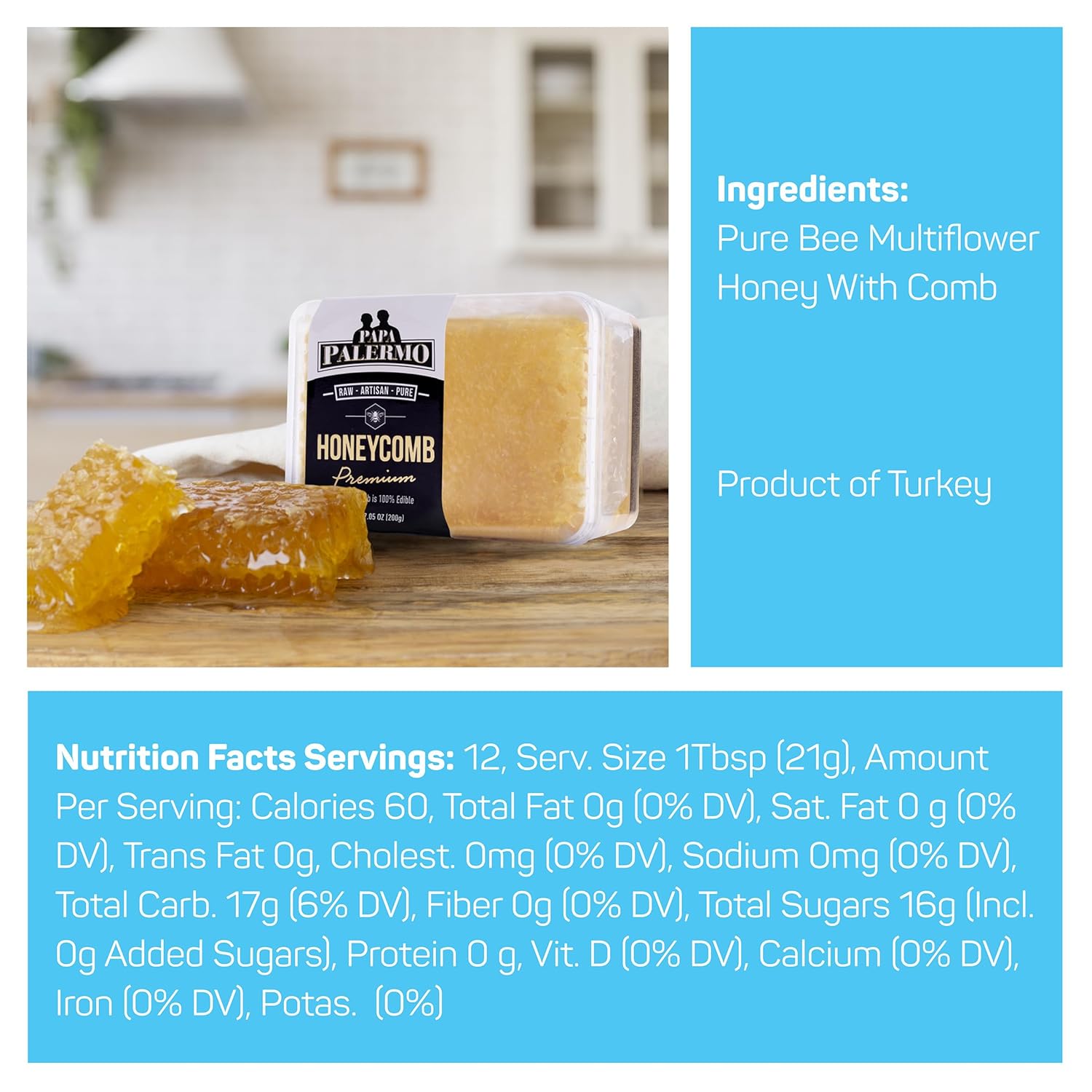 Papa Palermo bring you 100% raw honeycomb, unfiltered and untouched, just as nature intended. This edible honeycomb delivers the rich, golden taste of real honey with honeycomb, perfect for pairing, or snacking on its own.
