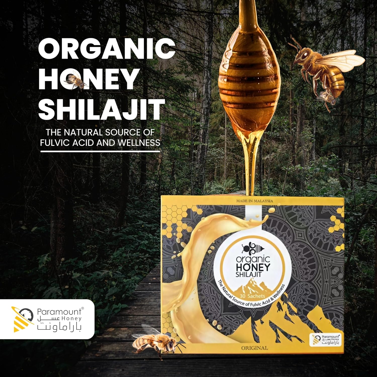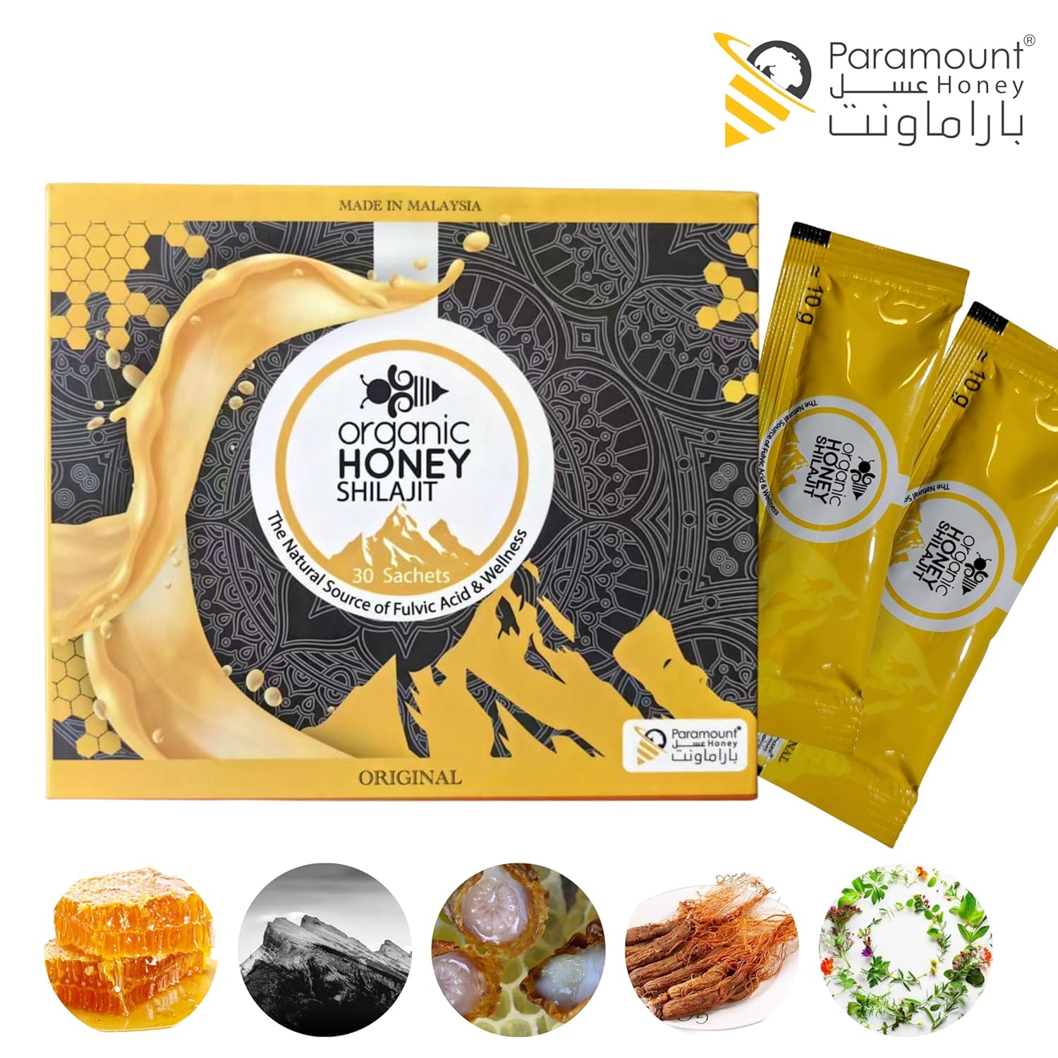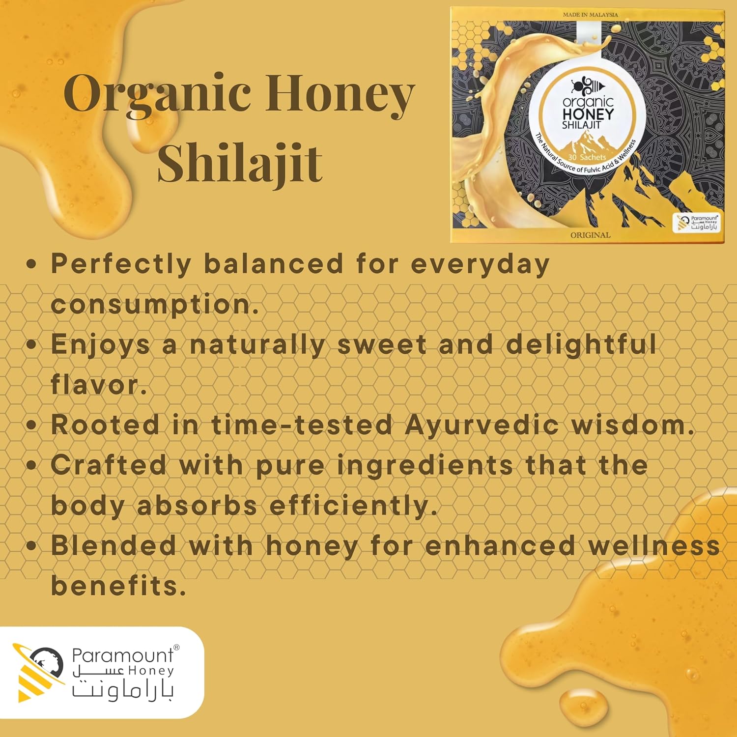 Crafted with Organic Honey & Shilajit Paramount Honey features a time-honored blend of pure organic honey and naturally sourced Himalayan Shilajit — traditionally valued for its energizing properties.Infused with Nature’s Best Enriched with Royal Jelly, Bee Pollen, Panax Ginseng, and herbal extracts — each ingredient selected to complement your wellness lifestyle.Supports Daily Vitality & Clarity A naturally inspired combination that fits seamlessly into your day-to-day routine, helping you stay focused and balanced.Clean, Additive-Free Formula No artificial preservatives or fillers — just nature’s finest ingredients in a clean and easy-to-consume form.On-the-Go Convenience Includes 30 individual sachets (10g each), ideal for enjoying at home, at work, or while traveling.