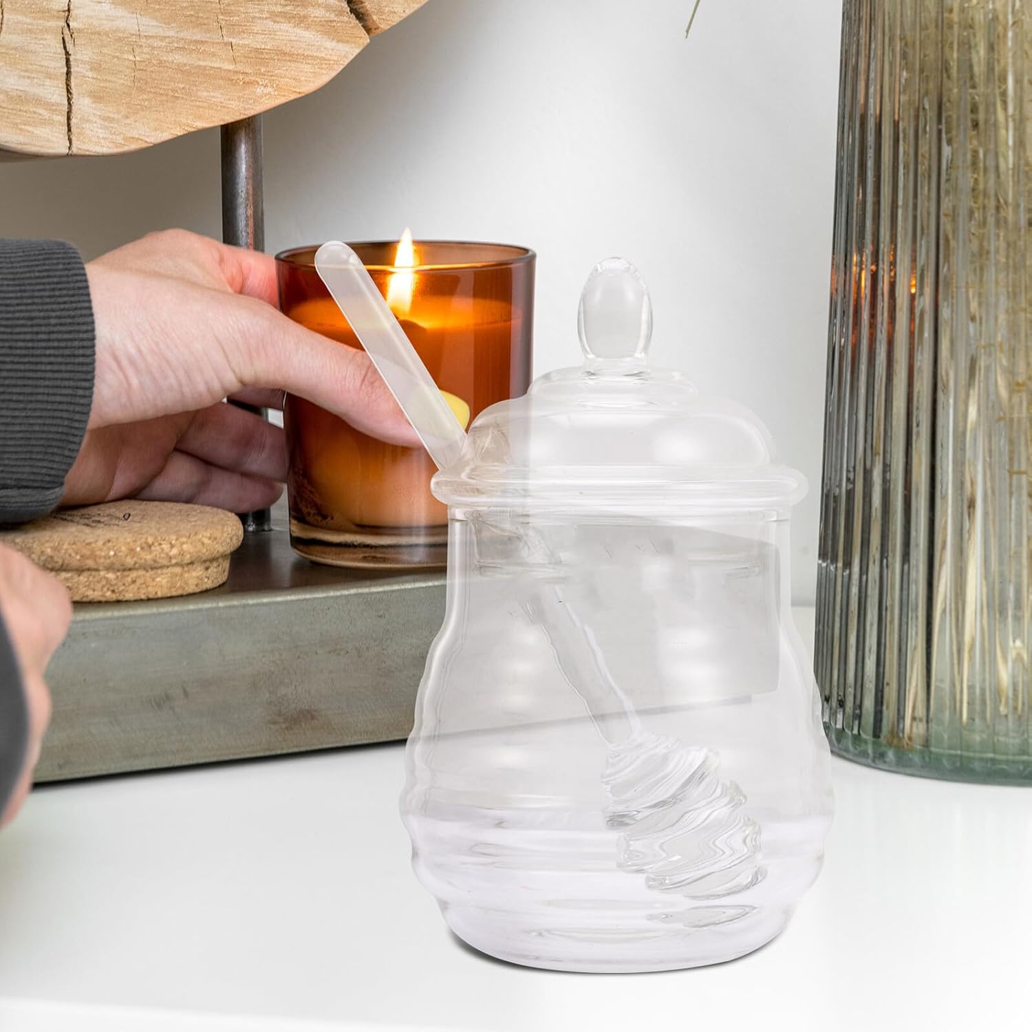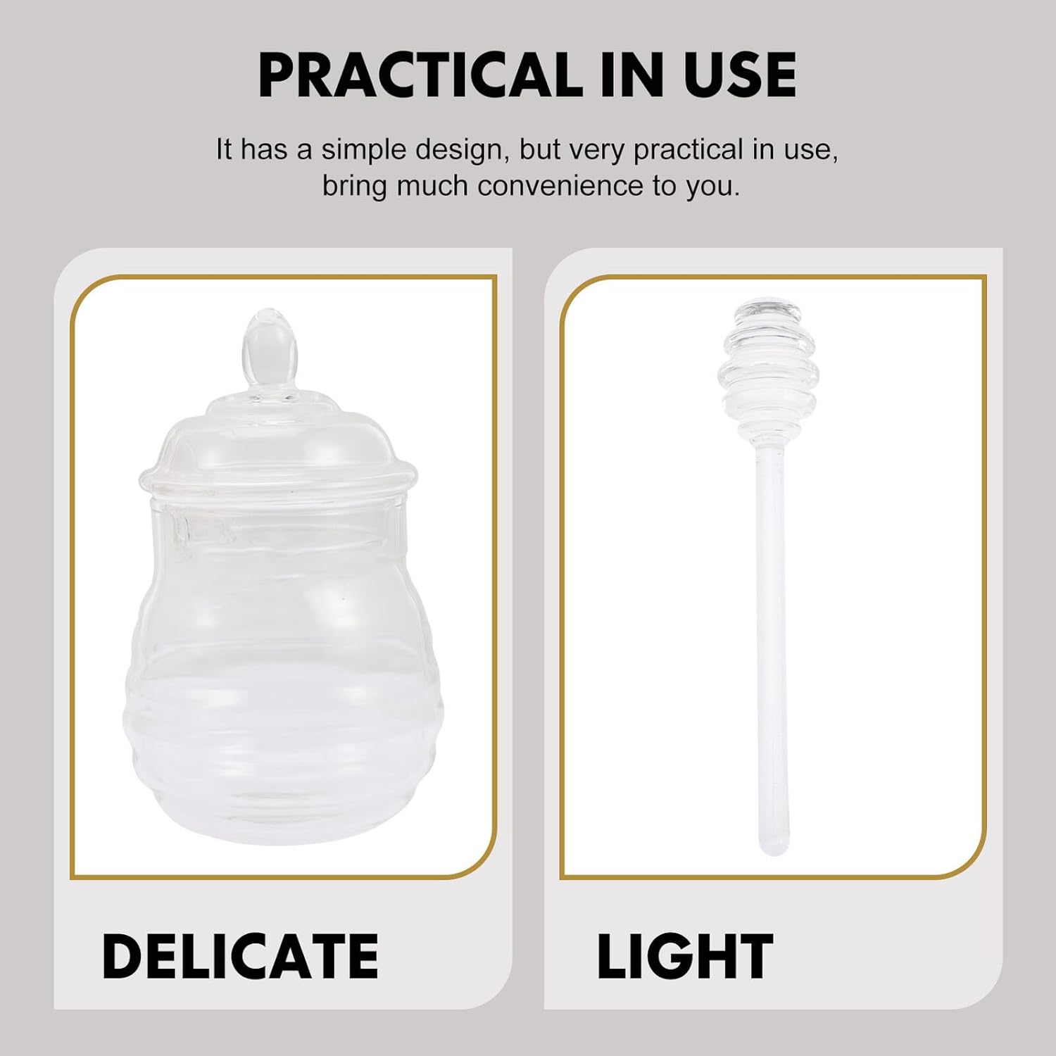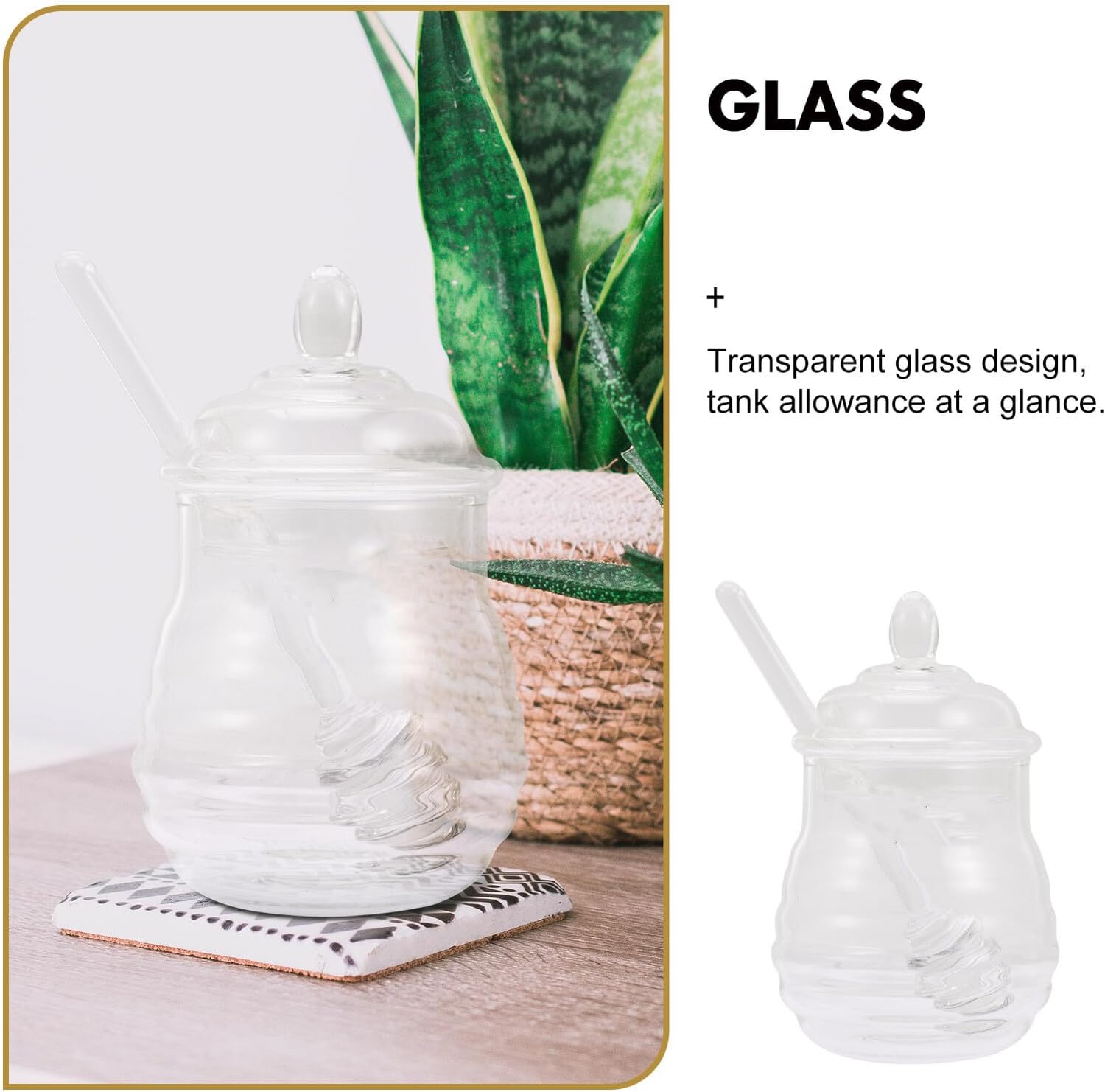 – The food storage jar is good for storing dry food, can be used as a tea storage canister, candy jar, honey pot, and more clear glass honey container.