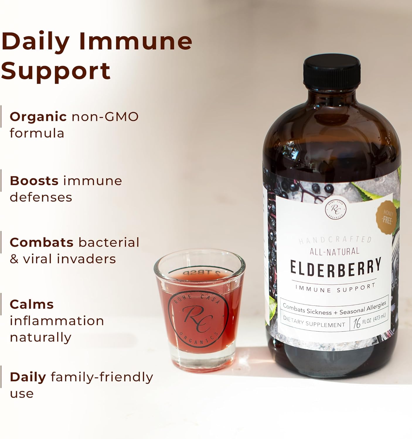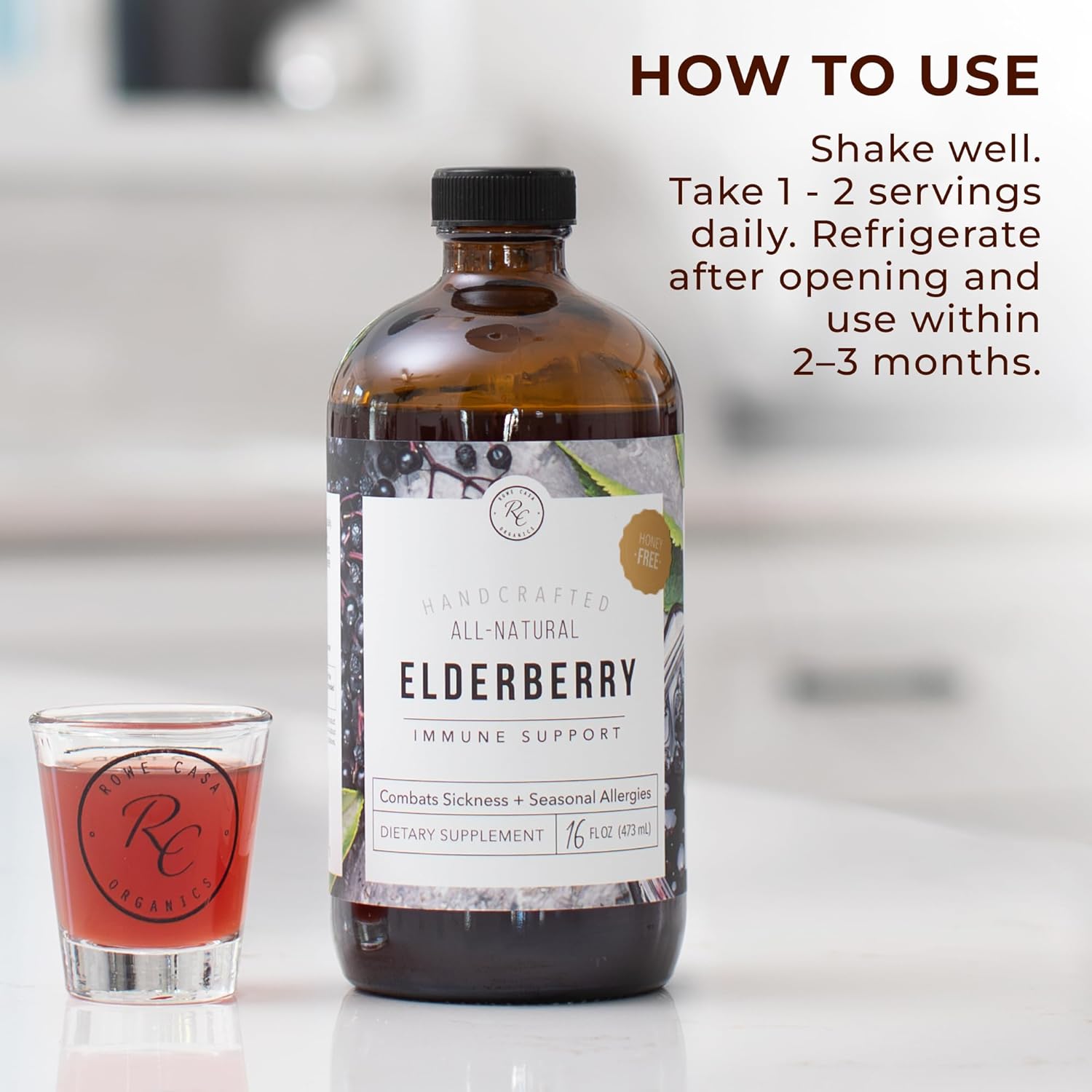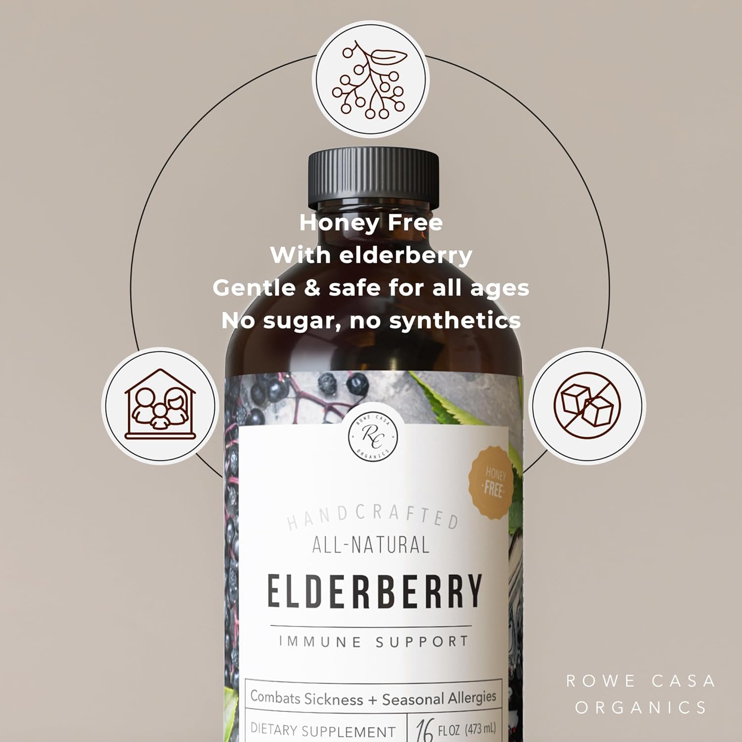 “Rowe Casa Organics Elderberry Immune Support – Natural Elderberry Syrup with Antioxidants, Zinc, and Vitamin C (16 Fl Oz) Rowe Casa Organics Elderberry Immune Support is a natural elderberry syrup for adults and children, made from premium organic black elderberries. Packed with antioxidants, this syrup helps support a healthy immune system and overall wellness. Elderberries are the second-highest antioxidant fruit, helping to protect cells and boost immunity. This powerful formula is enhanced with Vitamin C and Zinc for added immune-boosting support. Made with non-GMO, gluten-free, and natural ingredients, it’s safe for both adults and children. The delicious, berry-rich flavor makes it a favorite for the whole family, including toddler elderberry syrup for children aged 1 and up. For daily use, adults should take 1-2 servings, while toddlers (1+) can take half a serving. For extra support, take every 2-3 hours at the onset of symptoms. After opening, refrigerate and use within 2-3 months. With its potent formula, natural ingredients, and great taste, Rowe Casa Organics Elderberry Immune Support is the perfect addition to your family’s wellness routine. Children under 1 should not ingest honey. Opt for our honey free version.”