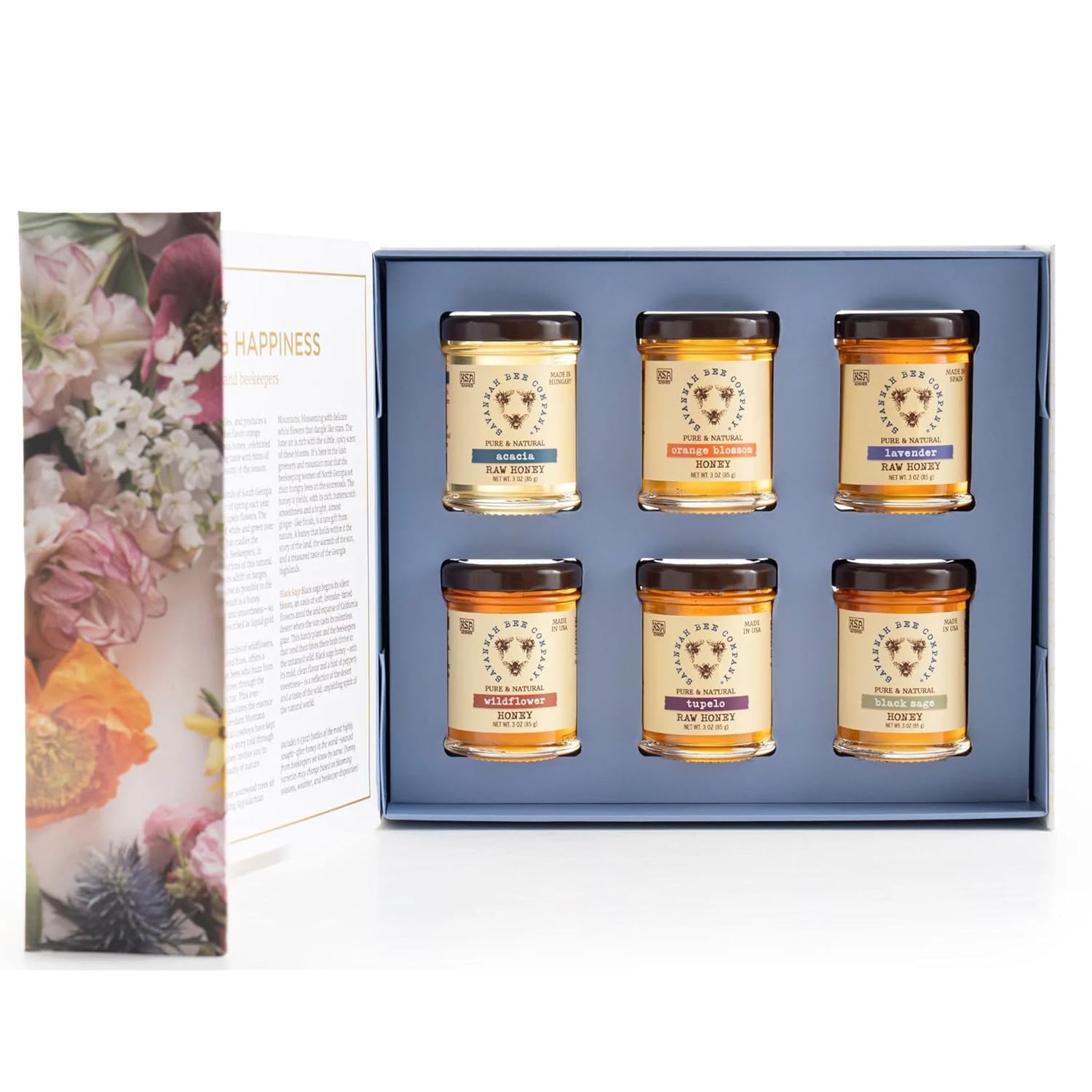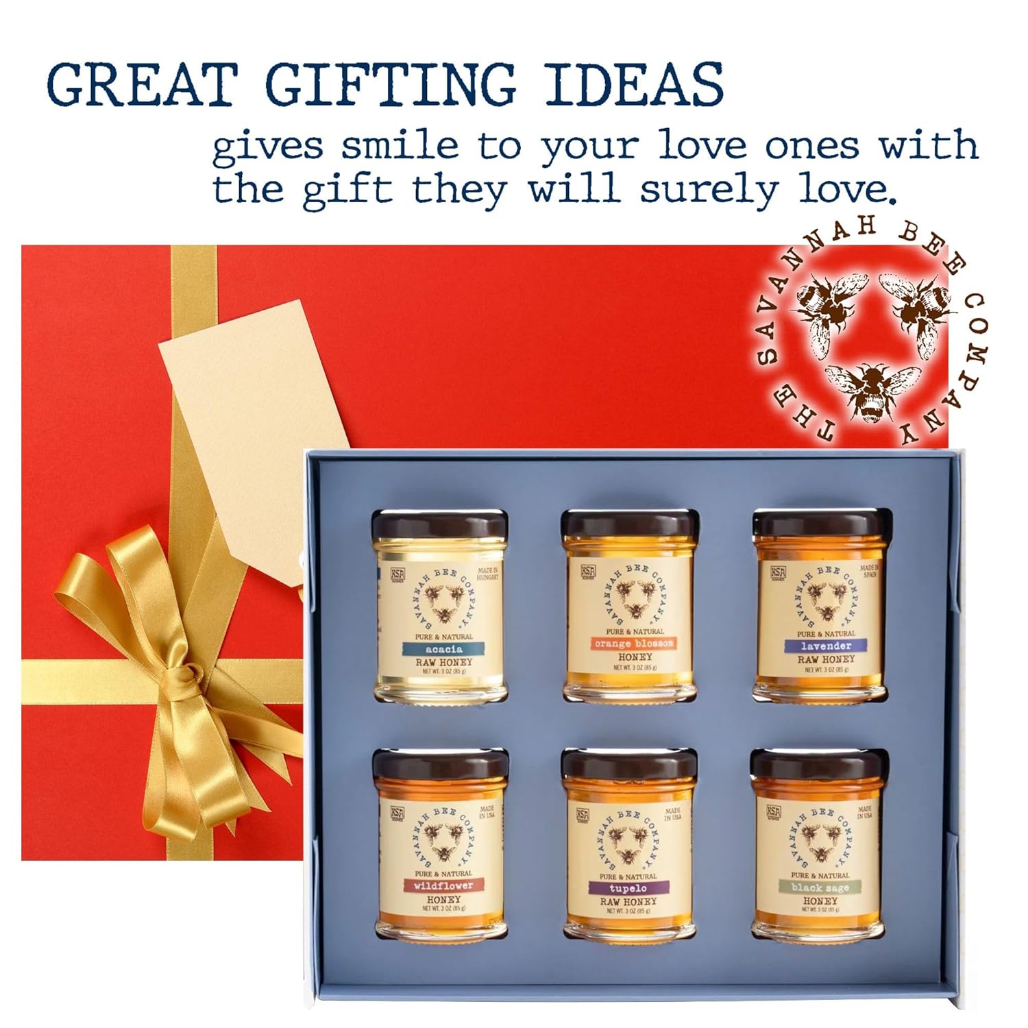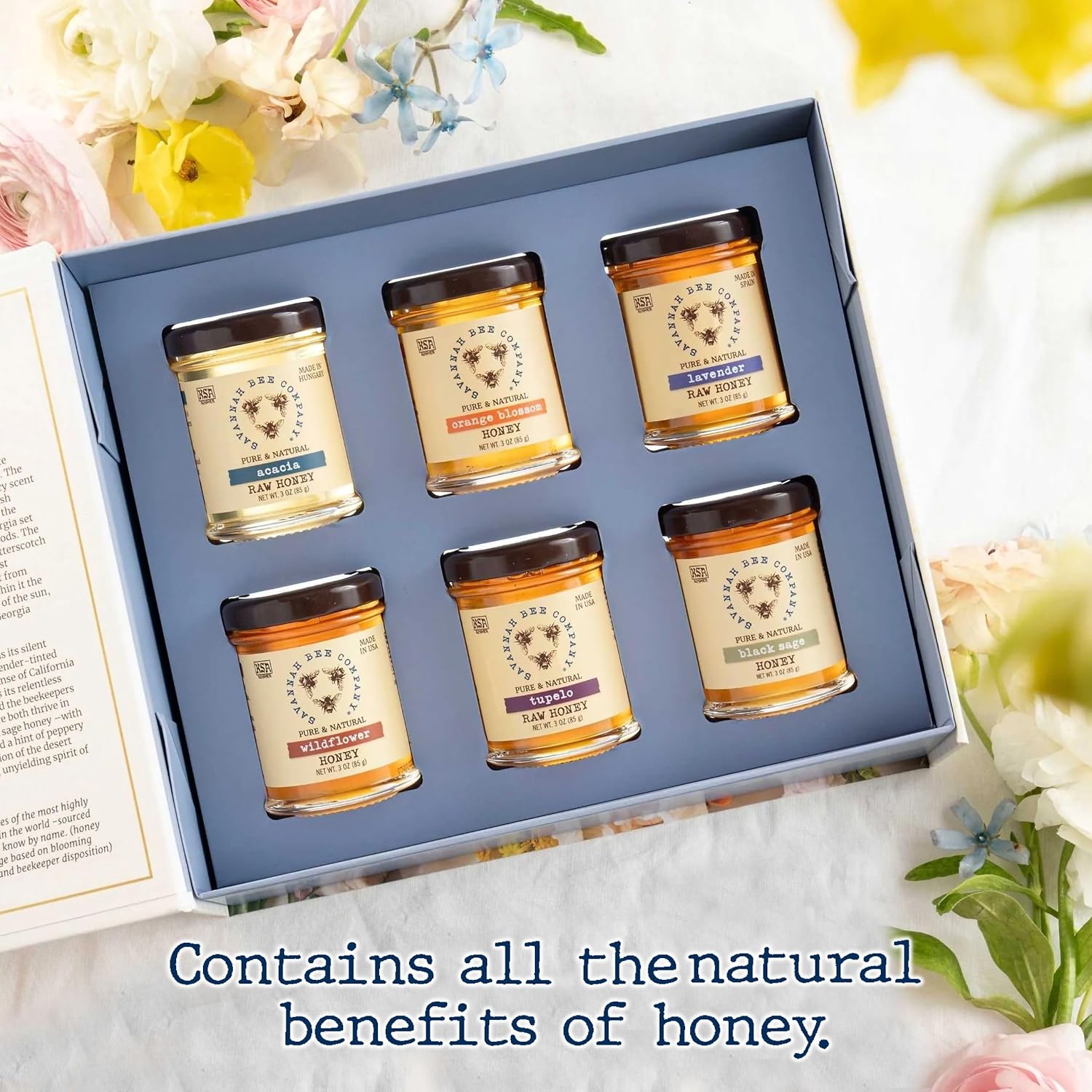 NATURE’S BOUNTY – Enjoy nature’s bounty with this gift set of pure honey containing six 3 oz glass jars of different varieties from Savannah Bee Company with detailed descriptions.