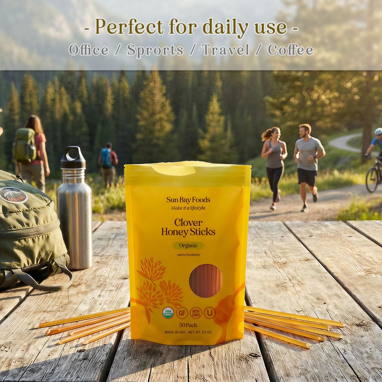 Sunbay Foods Organic Honey Sticks – 100% Pure Raw Clover Honey Straws – Easy to Open Natural Sweetener for Tea, Coffee, Healthy Snacks, Hiking & Gym- Made in the USA with Real Honey (50, Clover)