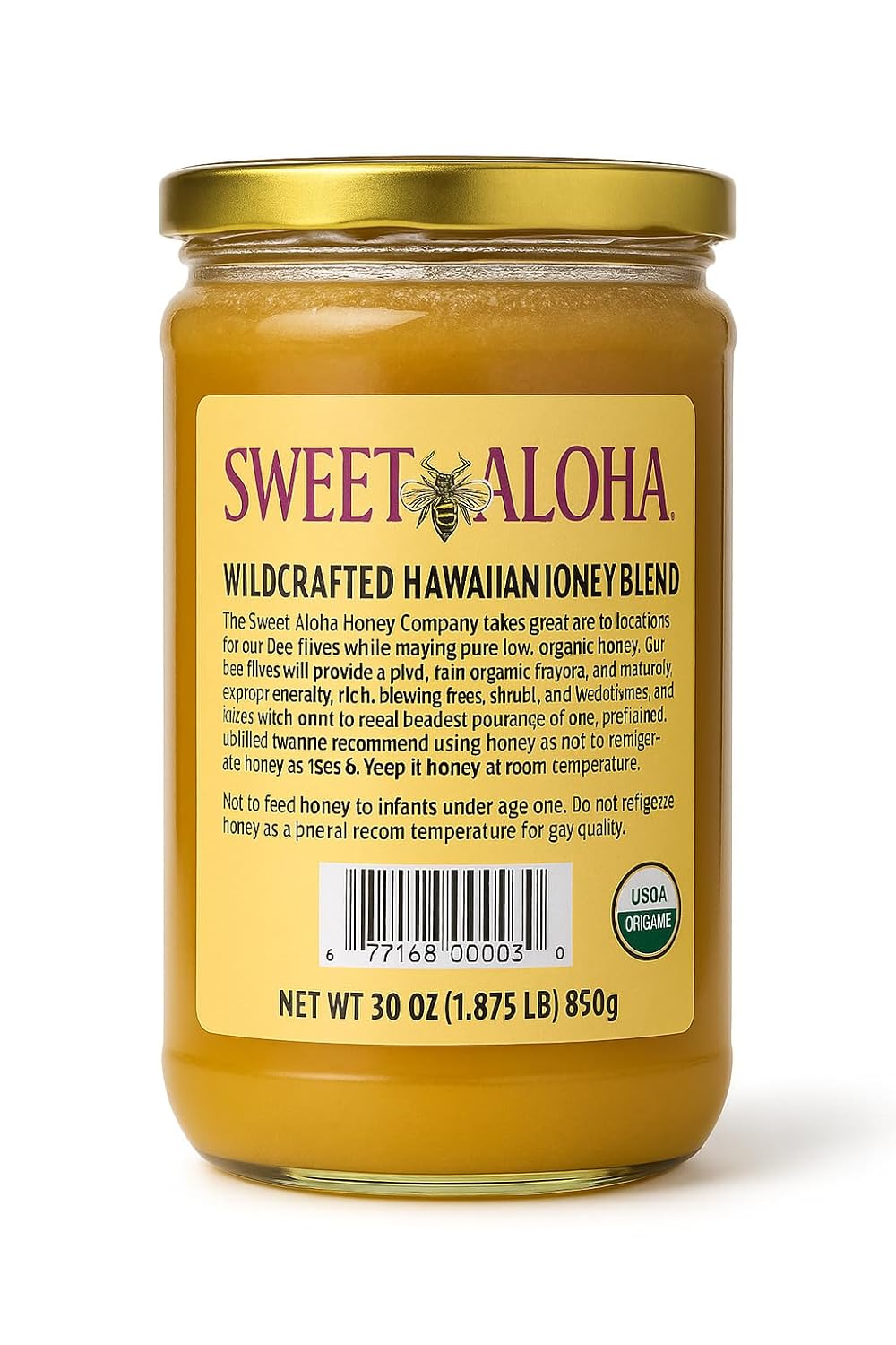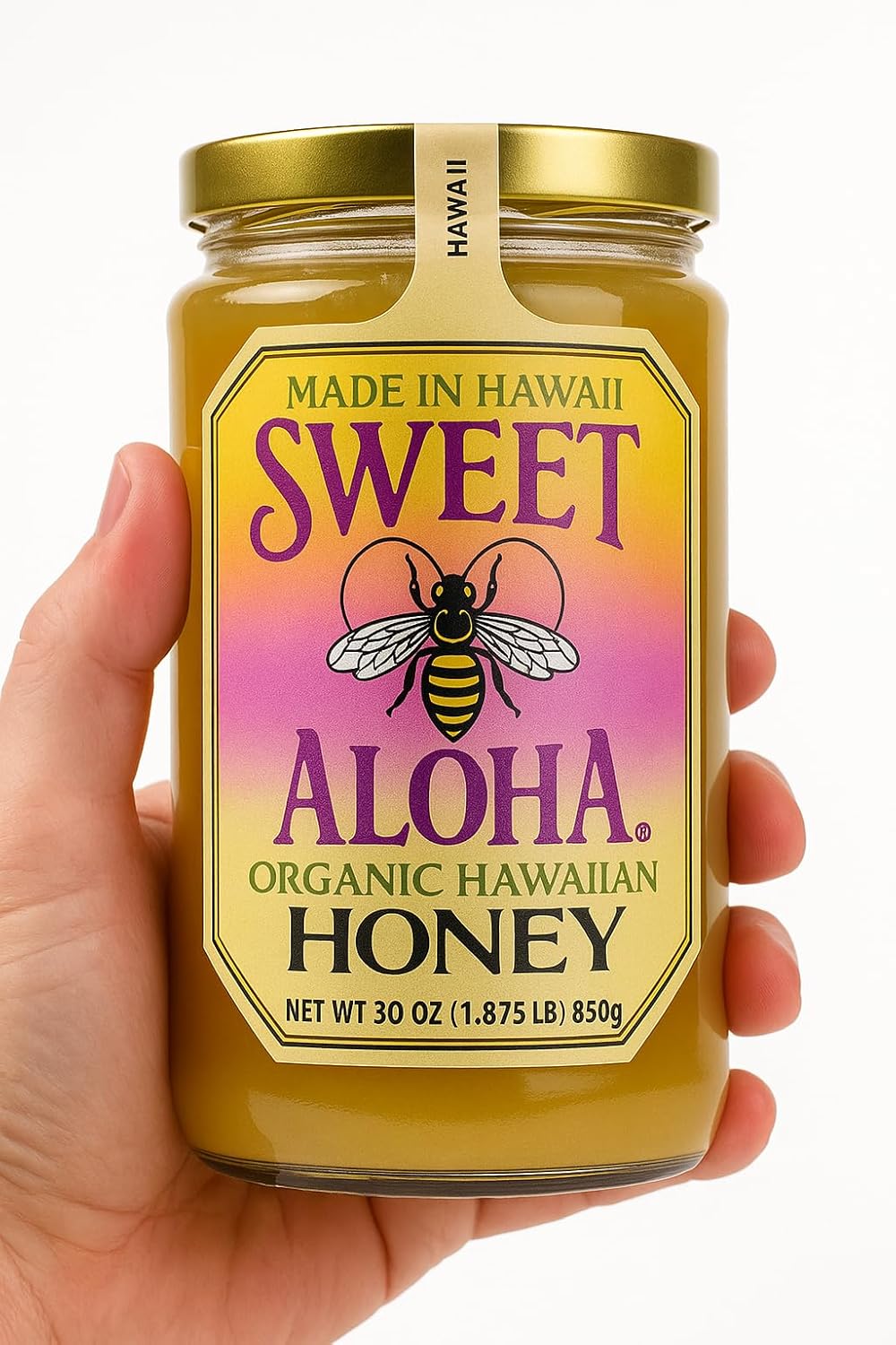 Sweet Aloha Organic Hawaiian Raw Honey is a 100% certified organic, unfiltered, and unheated honey harvested from multifloral blossoms in Hawaii. Hand-poured into a 30 oz glass jar, this wildcrafted blend preserves its natural enzymes, flavor, and creamy texture. Sustainably produced and non-GMO, our honey is ideal as a sweetener for teas, baking, or everyday use. Made in Hawaii by the Sweet Aloha Honey Company.
