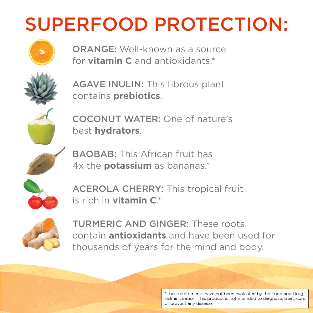 INGREDIENTS: Organic orange juice, organic agave inulin, organic lime juice, organic nectarine flavor, organic coconut water, organic honey flavor, organic acerola juice, organic baobab fruit, organic turmeric root powder, citric acid, organic ginger extract and organic monk fruit. Allergen: Contains tree nuts (coconut)