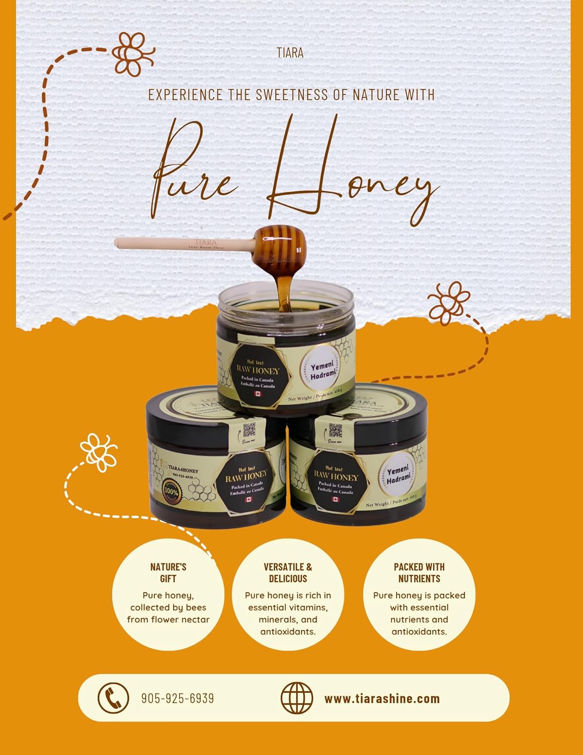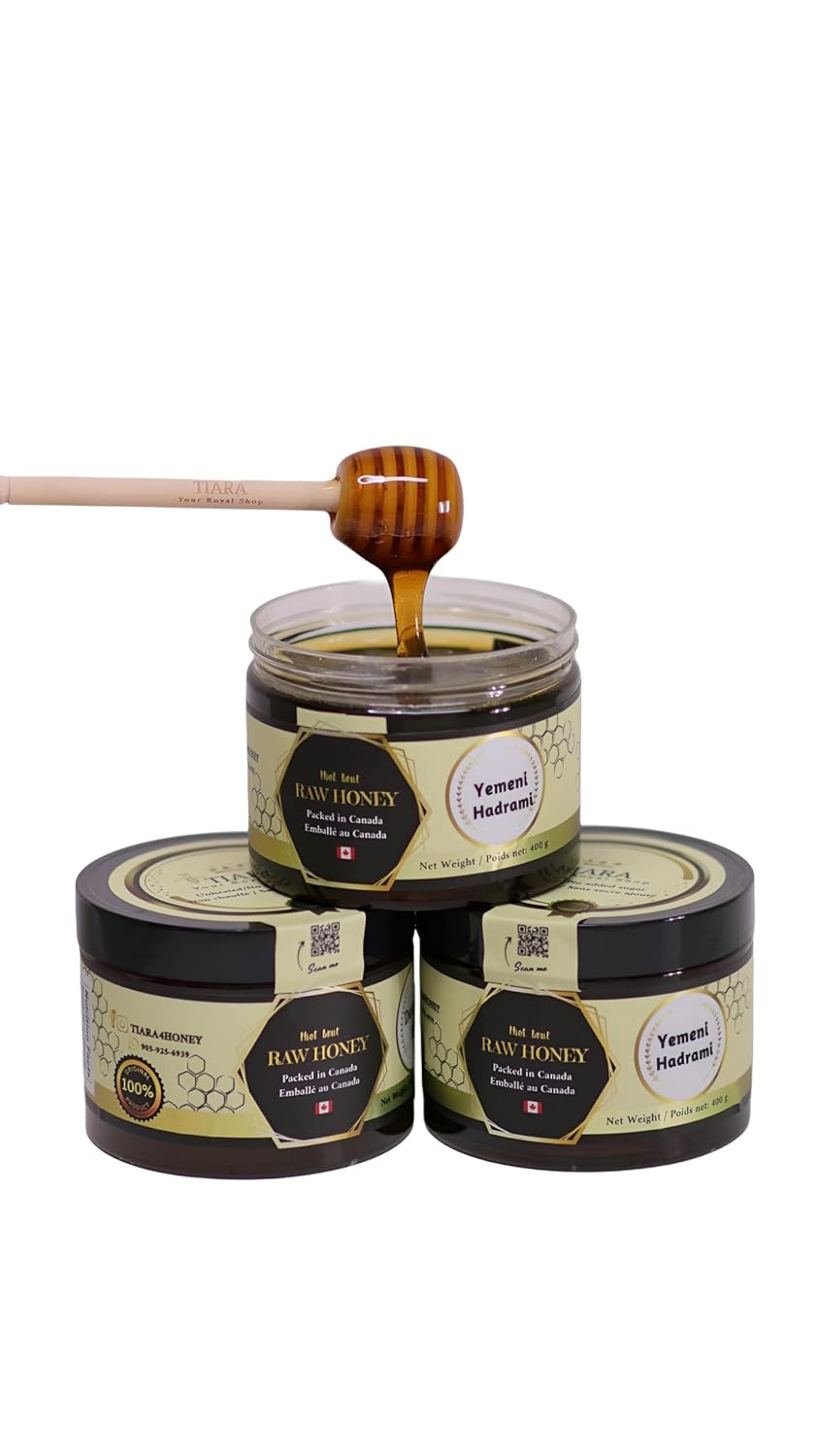 Discover the rich flavor and exceptional quality of TIARA Yemeni Hadrami Honey. Sourced from Hadrami wildflowers in Yemen, this rare honey is brought to Canada, CFIA certified and packed under Health Canada standards for maximum safety and freshness. Our honey is 100% raw, pure, unheated, unpasteurized, and unfiltered, retaining all natural enzymes, antioxidants, and nutrients. Known for its smooth texture and unique floral taste, Hadrami honey is perfect for boosting immunity, supporting digestion, and providing natural energy. Special Gift Included: Each jar includes a wooden honey dipper for easy serving and a traditional touch, making it a perfect gift for family or friends. Packaged in a generous 14 Fl Oz, 400g jar in Canada, this premium honey guarantees both authenticity and quality you can trust.