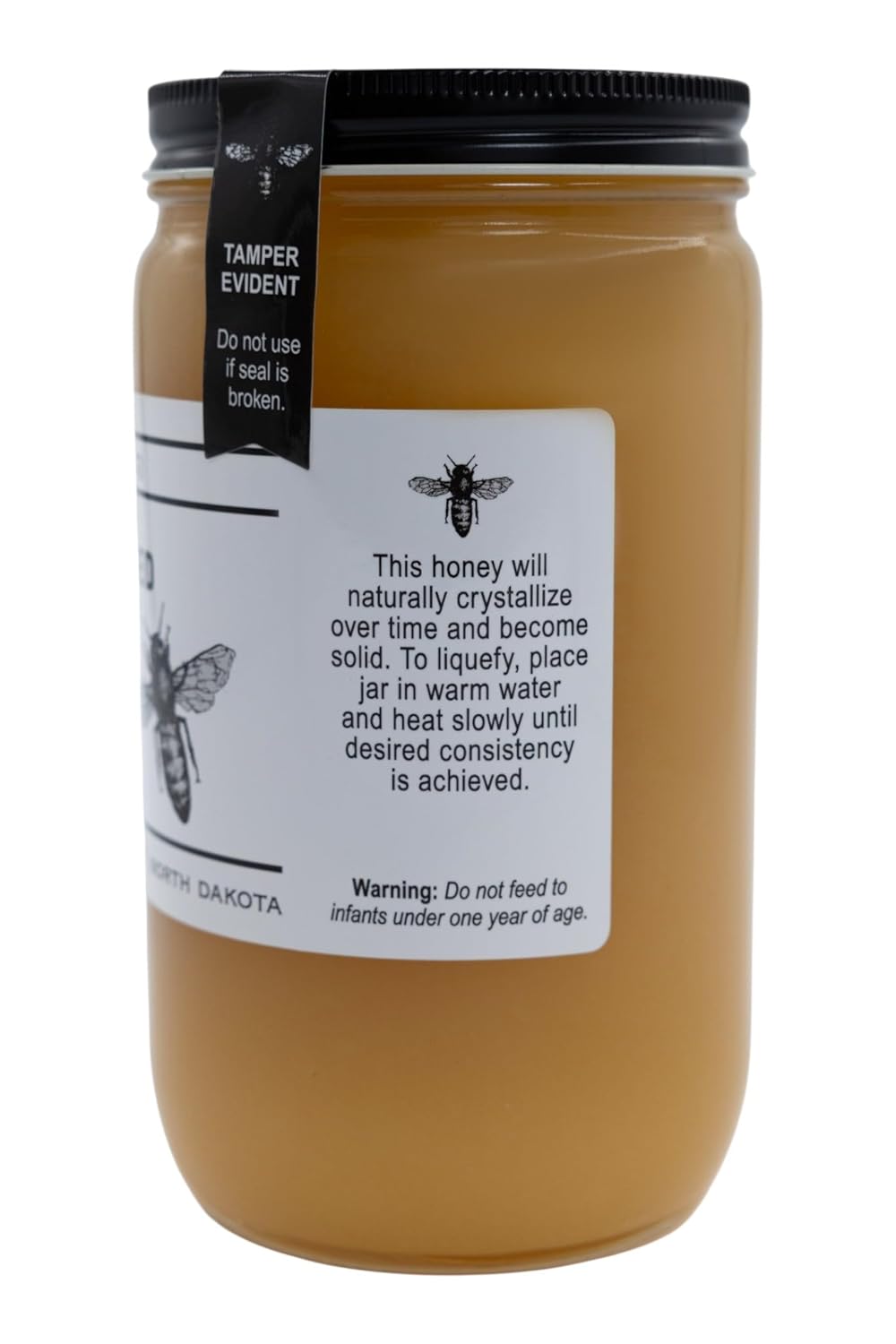 It is made from pure, raw honey sourced from bees that have foraged on yellow and white sweet clover and alfalfa in the North Dakota prairie.