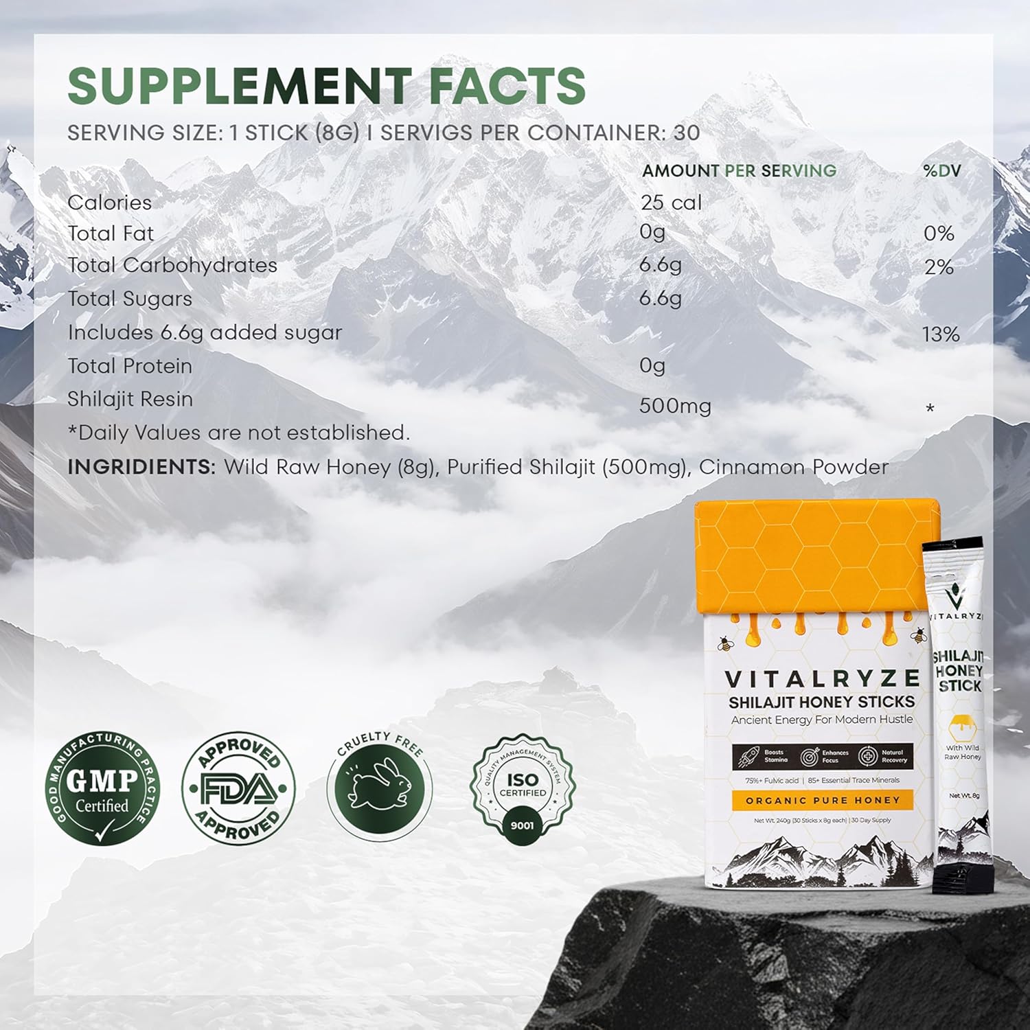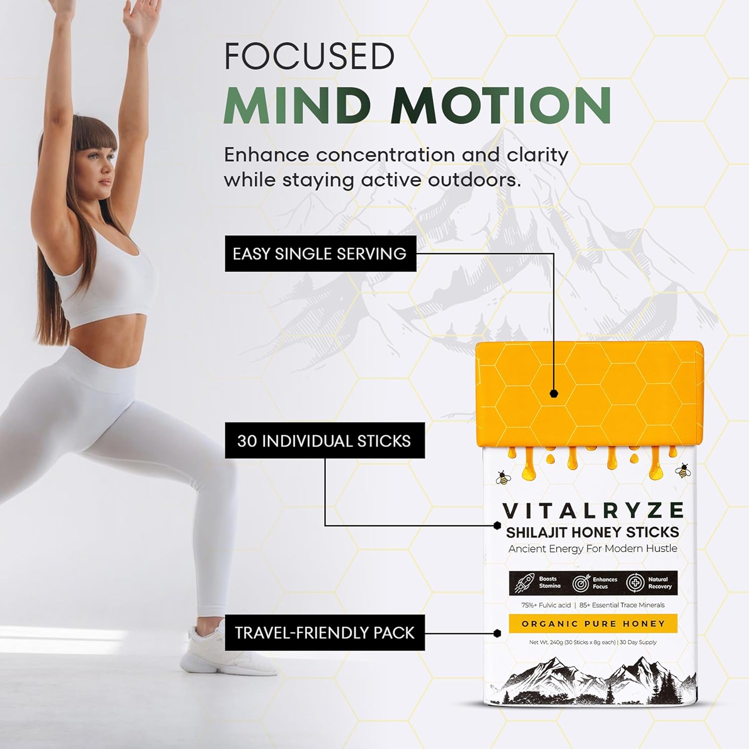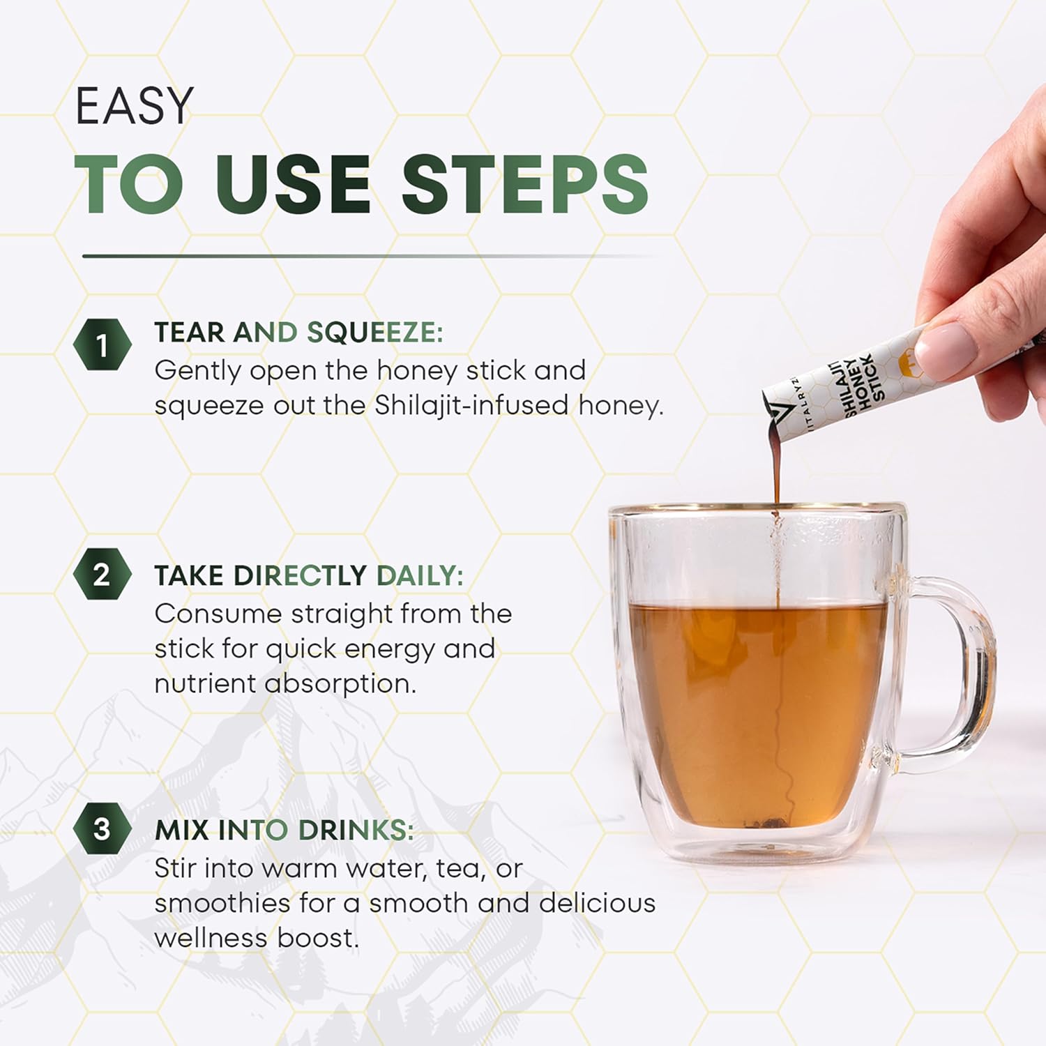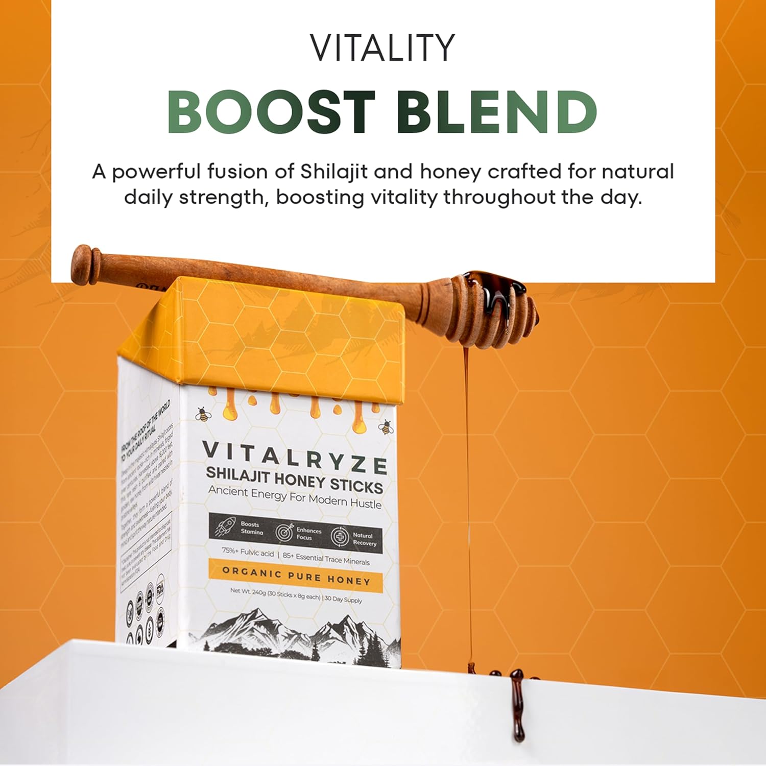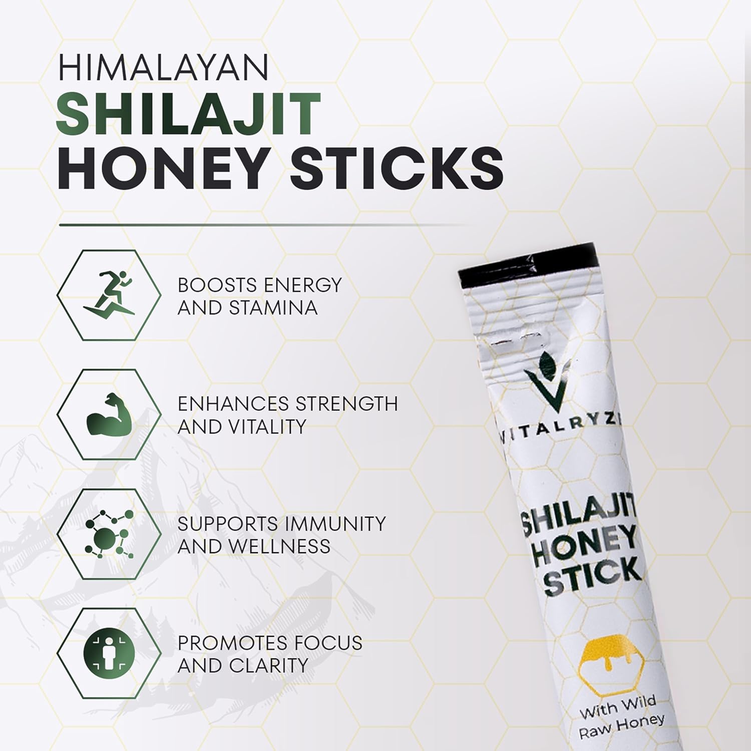 Discover a natural way to boost your daily routine with VITALRYZE’s Shilajit + Honey Sticks. Sourced from the pure heights of the Himalayas, our Shilajit is combined with raw, hive-extracted honey to create a wholesome blend that supports your body and mind—without any additives or preservatives. These convenient sticks are designed to help you feel more energized and active throughout the day. Rich in essential minerals, Shilajit Honey Sticks may support stamina, helping you manage tiredness and stay on top of your game. Whether you’re powering through a workout or simply need an extra push, this natural blend can be your go-to companion. The combination of Shilajit and honey also helps support muscle strength and recovery, making it a great addition to your active lifestyle. Plus, it contains essential vitamins like B6, thiamin, niacin, and riboflavin—known for supporting focus and clarity. Take a step toward holistic wellness with this time-honored blend. VITALRYZE’s Shilajit + Honey Sticks bring together nature’s best to help you feel balanced, refreshed, and ready for whatever your day holds.