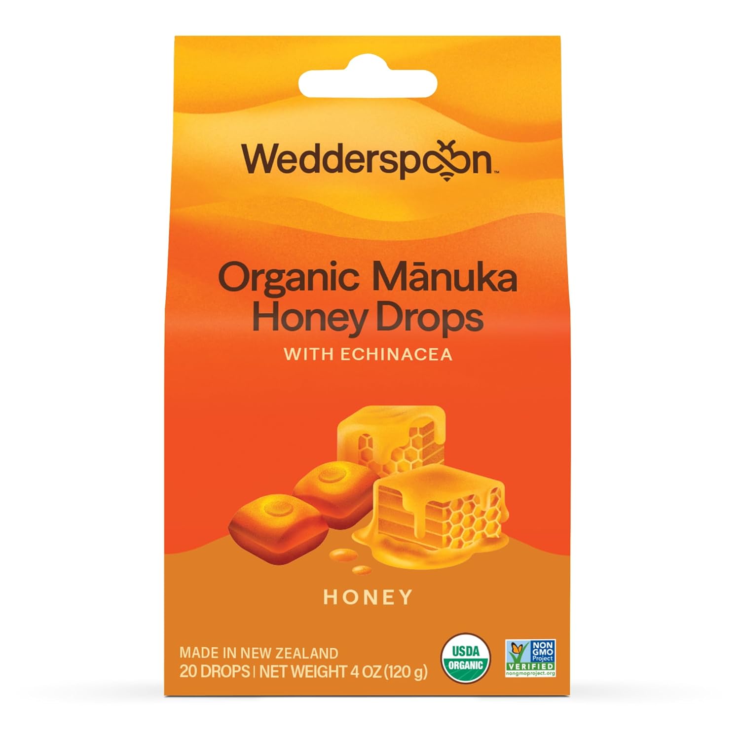 ORGANIC COUGH DROPS: Wedderspoon Manuka Honey Soothing Drops include Echinacea which promotes immune health; Honey is excellent for dry throats, and they taste great; 20 drops