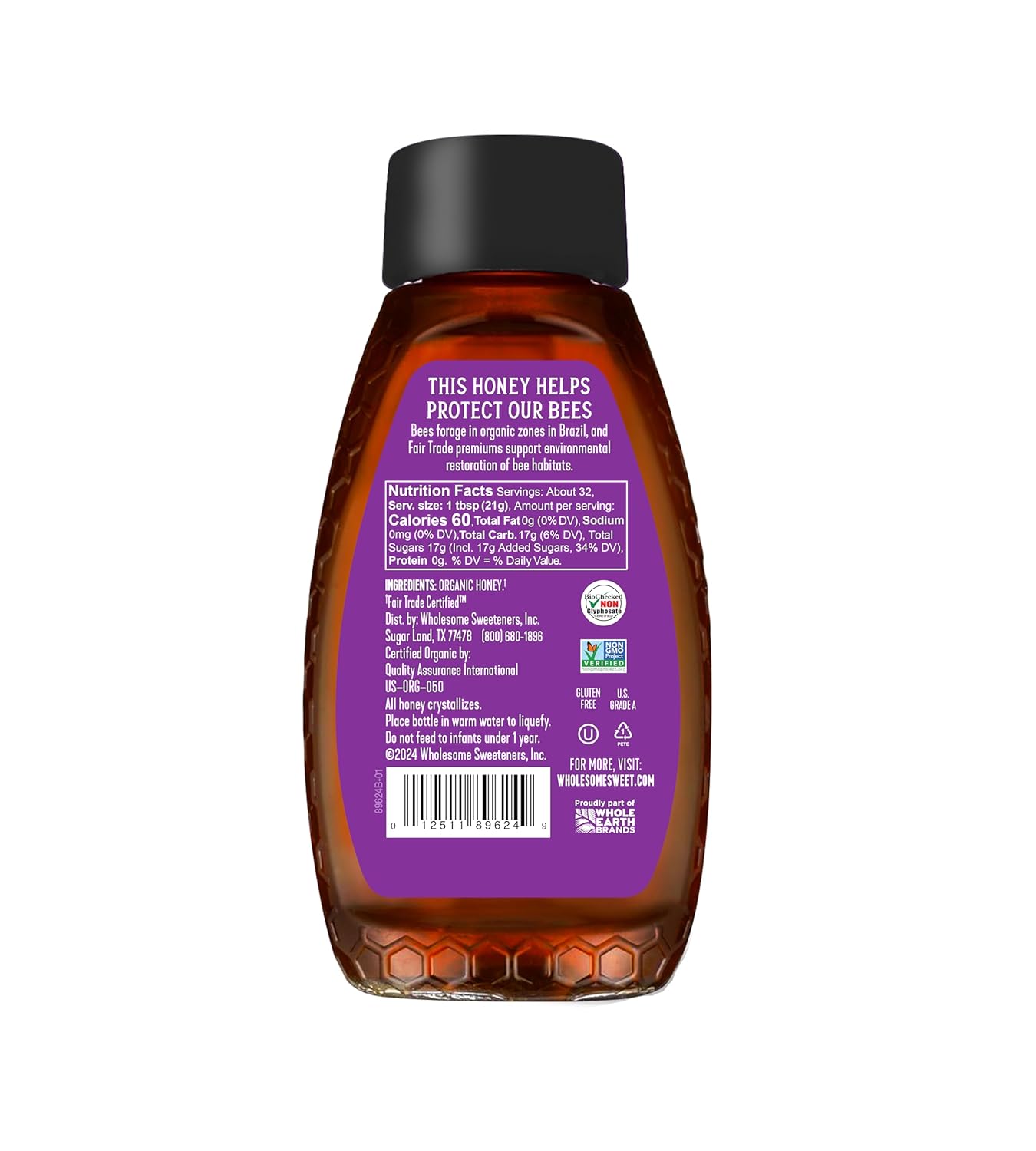 Wholoesome Sweeteners is on a mission to create positive meaningful change by bringing bakers, makers and farmers together through better food. We believe everyone deserves All the Best – in your baking and making, for our farmers and for our planet. Wholesome Organic Raw & Unfiltered Honey is deliciously decadent, with only one simple, pure ingredient – organic honey. Our organic, raw, unfiltered honey is perfect for salad dressings, sauces, and warm beverages. We love it as a topping for yogurt and in baking too! Our organic honey comes from bees foraging in organic zones in Brazil.USDA Organic, Fair Trade Certified, Non-GMO Project Verified, Kosher Certified, Gluten Free, and BioChecked Non-Glyphosate