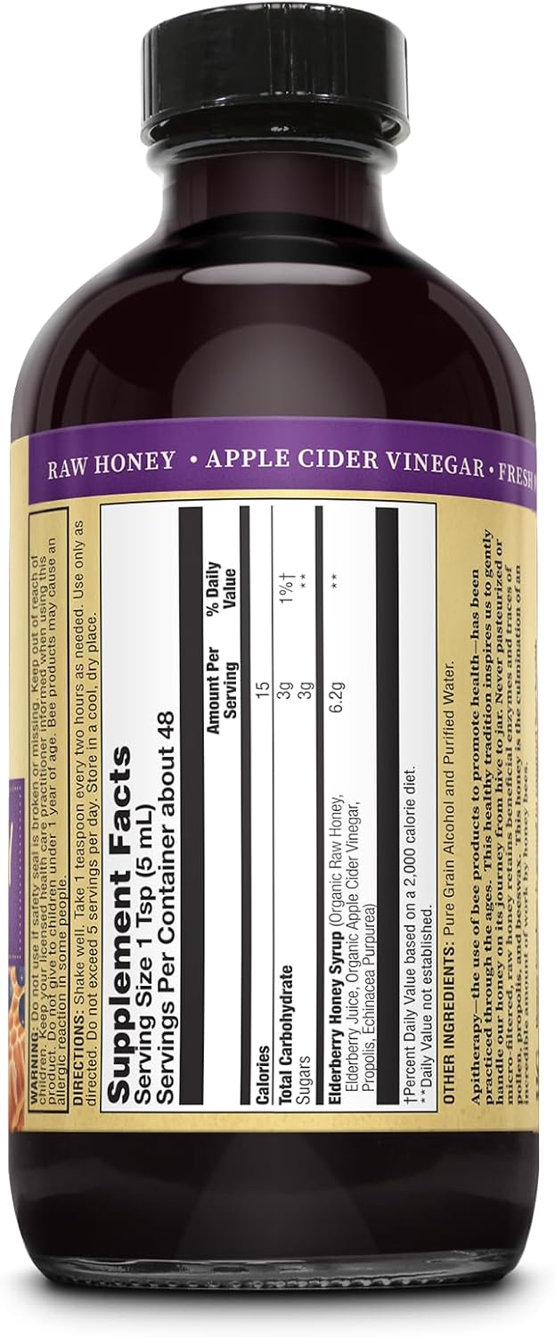 Elderberries have long been used in Native America and the Vermont farm kitchen. Traditionally used for general well-being during the cold season, they naturally contain Vitamin C. Apitherapy honey has never been heated or filtered, and thus it retains the beneficial traces of pollen, propolis, and beeswax which the flowers and bees have provided. Proprietary blend: raw honey, elderberries, apple cider vinegar, propolis, Echinacea organic other ingredients: 3% pure grain alcohol = organic.